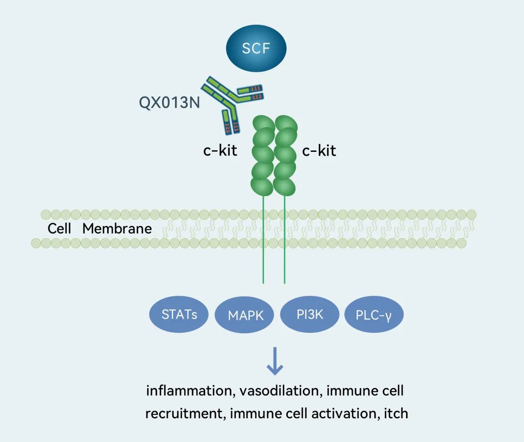 “荨麻疹被认为是一种主要由肥大细胞脱颗粒引起的疾病,c-kit是慢性自发性荨麻疹的主要效应细胞——肥大细胞的主要调节因子。”荃信生物创始人、董事长兼CEO裘霁宛介绍,QX013N旨在下调下游信号传导并抑制慢性自发性荨麻疹的发展,该产品通过与c-kit特异性结合,抑制肥大细胞的分化、成熟、存活、增殖和脱颗粒,达到消减和耗竭肥大细胞目的,从而用于肥大细胞驱动性疾病例如慢性自发性荨麻疹的治疗。