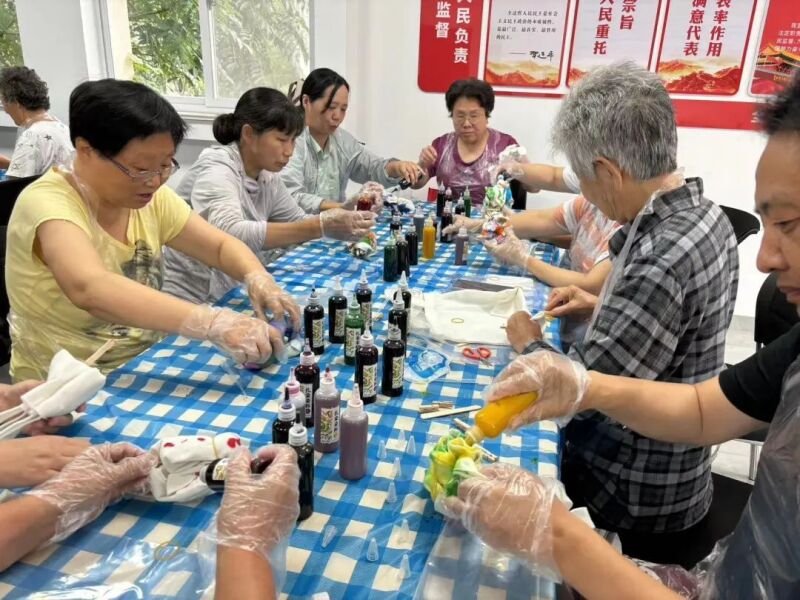 明珠社区开展了非遗文化传承活动。活动现场,老师先给老人们讲解了扎染的历史来源和制作方法,随后,大家跃跃欲试,穿上围裙、戴上手套,将手中洁白素净的布包随意缠绕、蜷曲、揪揪叠叠,并用皮筋一个个打结固定。最后用染料浸泡、晕染,一系列工序后,一块块普普通通的白布包摇身变成一个个图案丰富的印花布包。社区刘奶奶笑着说:“这是我第一次体验扎染手工技艺,不仅感受到非遗文化的魅力,还能亲手制作,感觉非常有意义。”