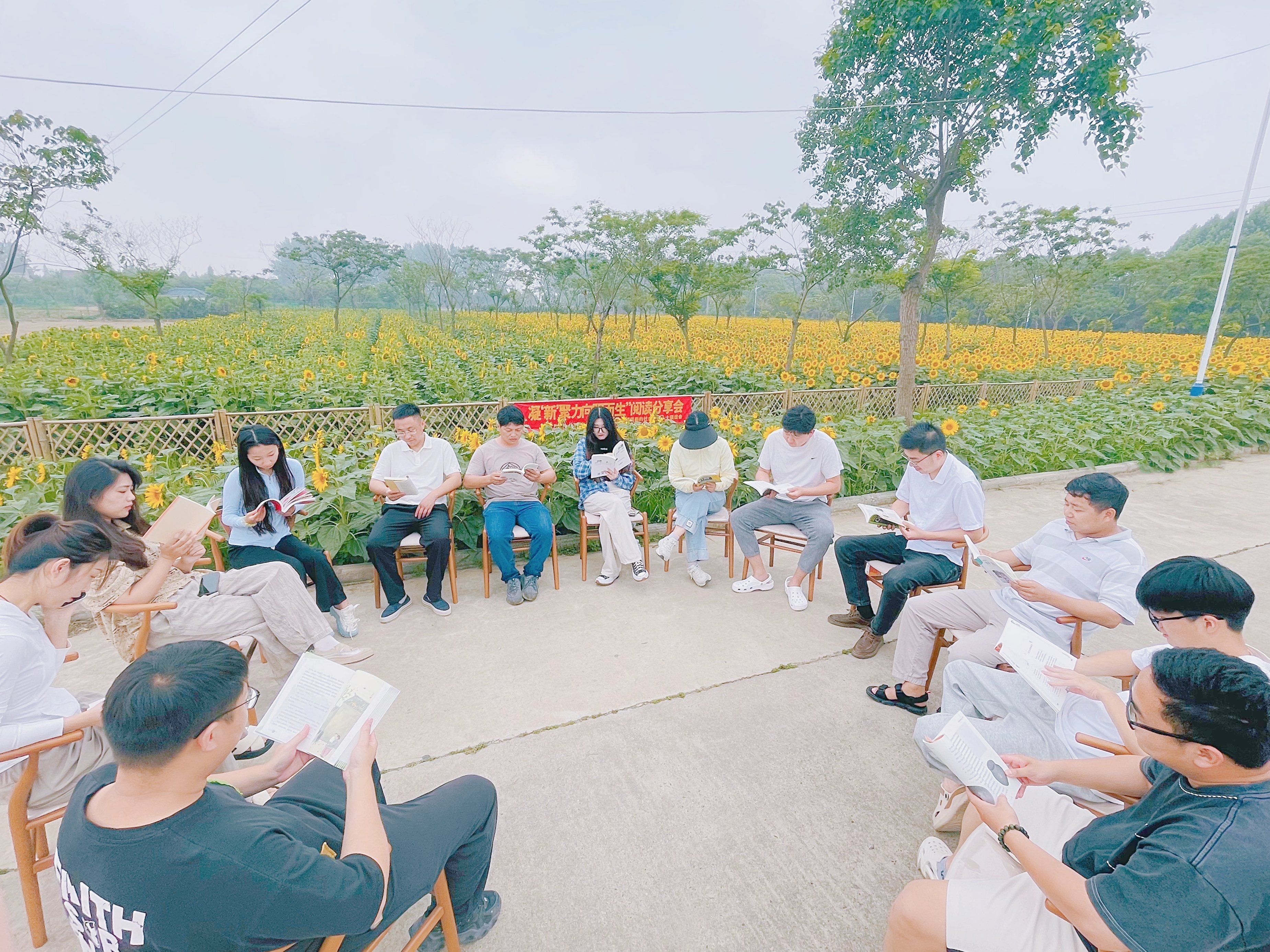 6月21日上午,大泗镇新联会在“大泗良食体验中心”的向日葵花海旁开展“凝‘新’聚力 向阳而生”主题阅读活动,20余名大泗镇新联会成员参加活动。活动中,大泗镇新联会秘书长纪伟分享了《遥远的向日葵地》一书。该书讲述了作者一家在乌伦古河岸的戈壁那段充满艰辛与奇遇的耕种生活,记录了劳作在向日葵地的人和他们朴素而迥异的生活细节。大家相互沟通、彼此交流,在轻松愉悦的氛围中分享了心得体会。
