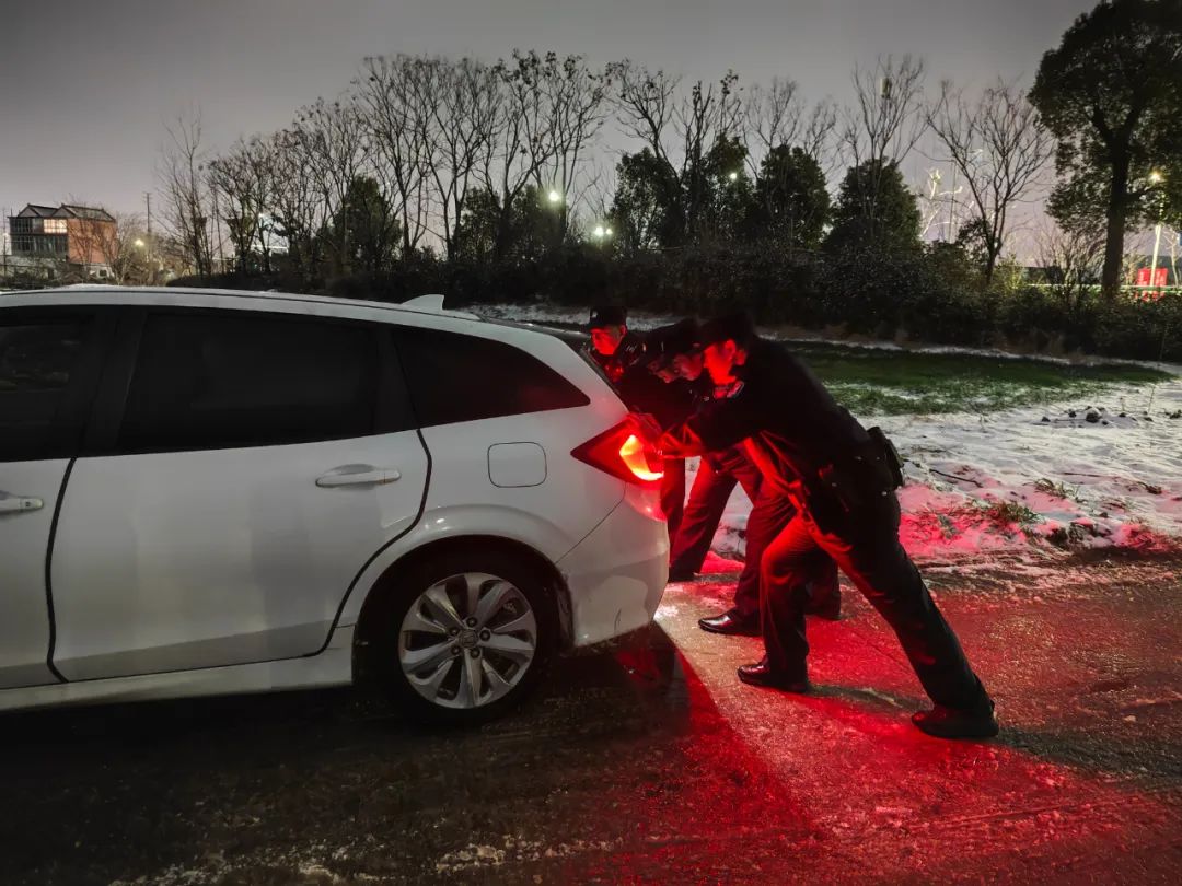 泰州市公安局医药高新区分局(高港分局)白马派出所民警辅警巡逻途中遇到一辆外地车辆因路面积雪打滑失去动力,民警辅警下车帮助驾驶员推车离开积雪严重路段,确保车辆安全通行,临行前叮嘱驾驶员雪天慢行,注意行车安全。