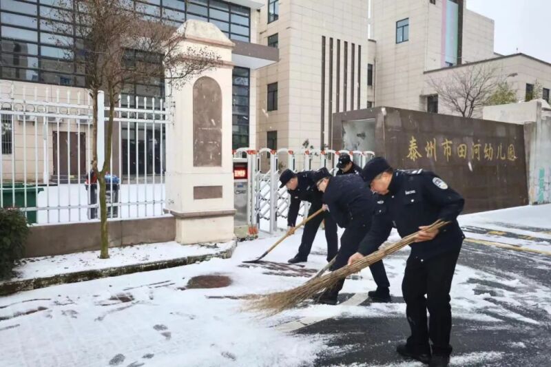2月22日下午,寒潮来袭,大雪纷飞。泰州市公安局医药高新区分局(高港分局)口岸派出所以“雪”为令,迎“寒”而上,立即组织民警辅警来到泰州市田河幼儿园门口扫雪,全力保障通行安全。