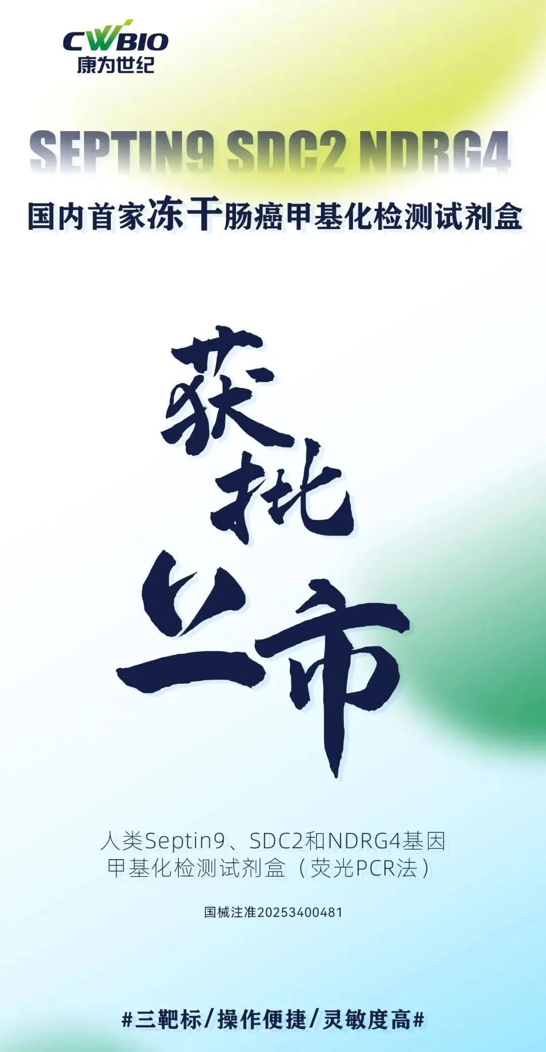 近日,康为世纪自主研发生产的人类Septin9、SDC2和NDRG4基因甲基化检测试剂盒(荧光PCR法)获批上市,这是我国冻干肠癌甲基化检测试剂盒第一张三类注册证,填补了行业空白。