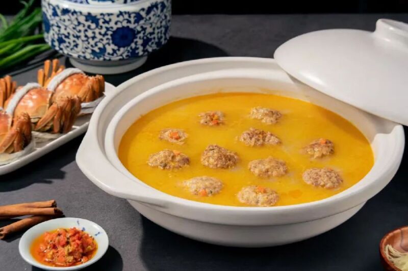 蟹黄狮子头选用胡庄镇当地养殖的“江水清沙”大闸蟹和土猪肉,蟹肉与猪肉同拌,蟹的鲜味浸入到狮子头,配以秘制高汤,采用传统工艺加工,外酥里嫩、肥而不腻、蟹香四溢、回味悠长,为秋冬季节的时令佳肴,深受广大食客喜爱。