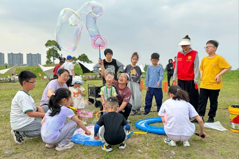 傍晚的草坪上人声鼎沸,创意绘画、投壶、泡泡秀、扔飞盘、拔河、马术体验六大趣味活动同步展开。在社区志愿者的引导下,来自生物医药产业园区的高层次人才家庭一同参与亲子互动游戏,儿童们追逐七彩泡泡的身影与天真的笑容交织成画。马术体验区更是排起长龙,骑手们戴上护具,在专业教练的指导下,昂首挺胸完成人生“首骑”。身着红色马甲的志愿者穿梭其间,文明实践的温暖浸润在每处欢声笑语中。