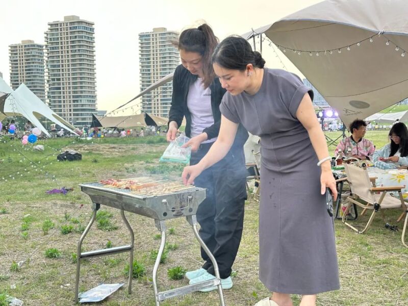 暮色渐浓,烧烤区的炭火点亮了社区“烟火气”。来自北大医学部(泰州)医药健康产业创新中心、ICGEB、泰州国大健康管理有限公司的青年人才朋友们化身“料理能手”,刷油、翻串,配合默契,各展所长。袅袅炊烟中,银发长者手把手教孙辈烤肉秘诀,滋滋作响的烤串串起跨越年龄的温暖对话。青丝白发相映成趣,烤架上的不仅是滋滋作响的美食,更是代际交融的文明薪火,升腾着“家”的味道。