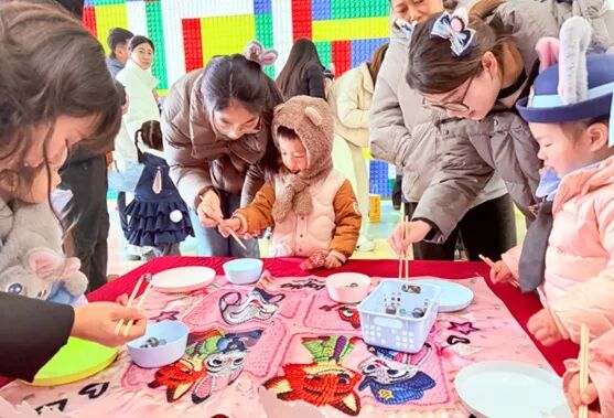 手工活动区是孩子们发挥创意的小天地,这里设置了夹珠子、钓福字、做动物面具、剪福字、拓印福字等多个趣味角。夹珠子游戏考验着家长小朋友的手眼协调能力,他们小心翼翼地用夹子夹起彩色珠子,成功后扬起的笑脸满是成就感;钓福字摊位前,孩子挥动钓竿,钓起一个个红彤彤的“福”字,寓意着马年福气满满。