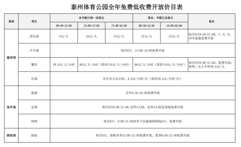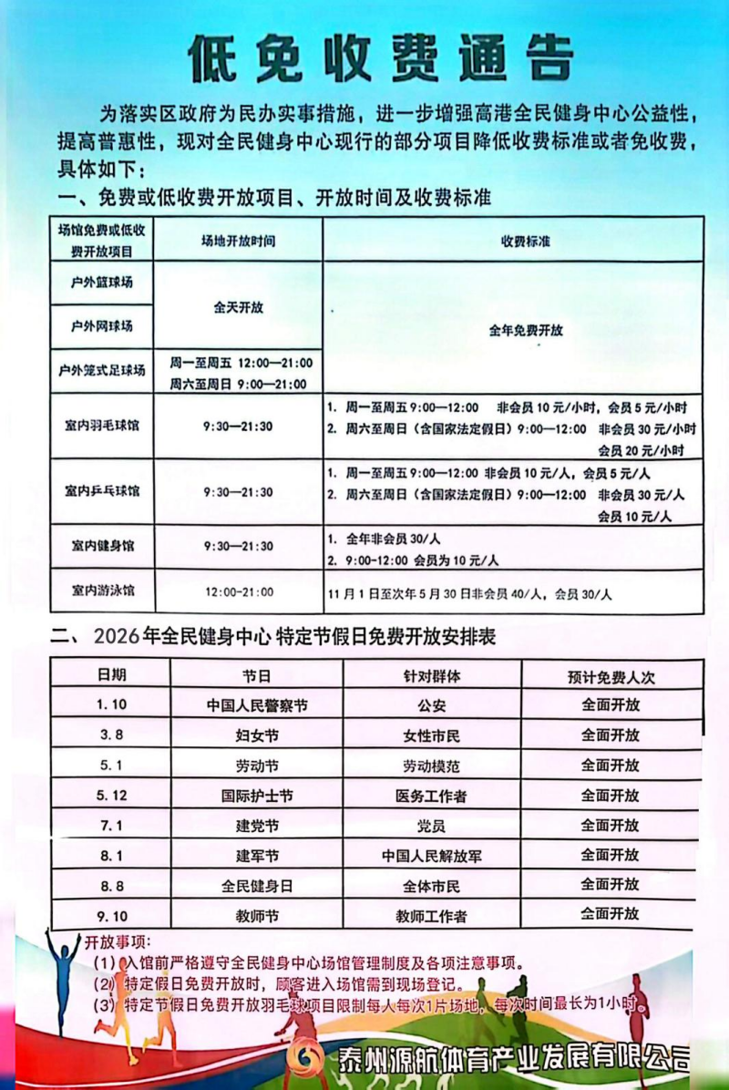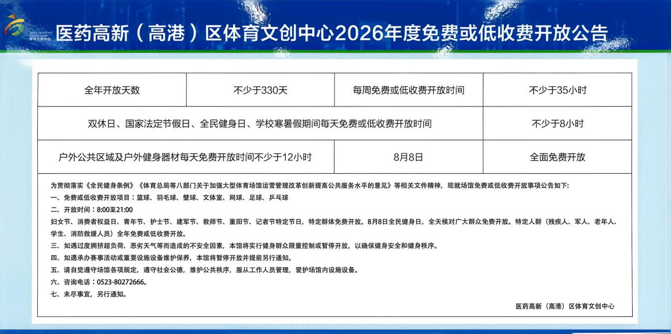 为认真贯彻落实《泰州市全民健身条例》,充分发挥公共体育场馆的社会效益,向公众提供良好的健身环境,满足广大居民群众日益增长的体育健身需求,现将2026年泰州医药高新区(高港区)公共体育场馆免费或低收费开放工作相关事项公告如下: