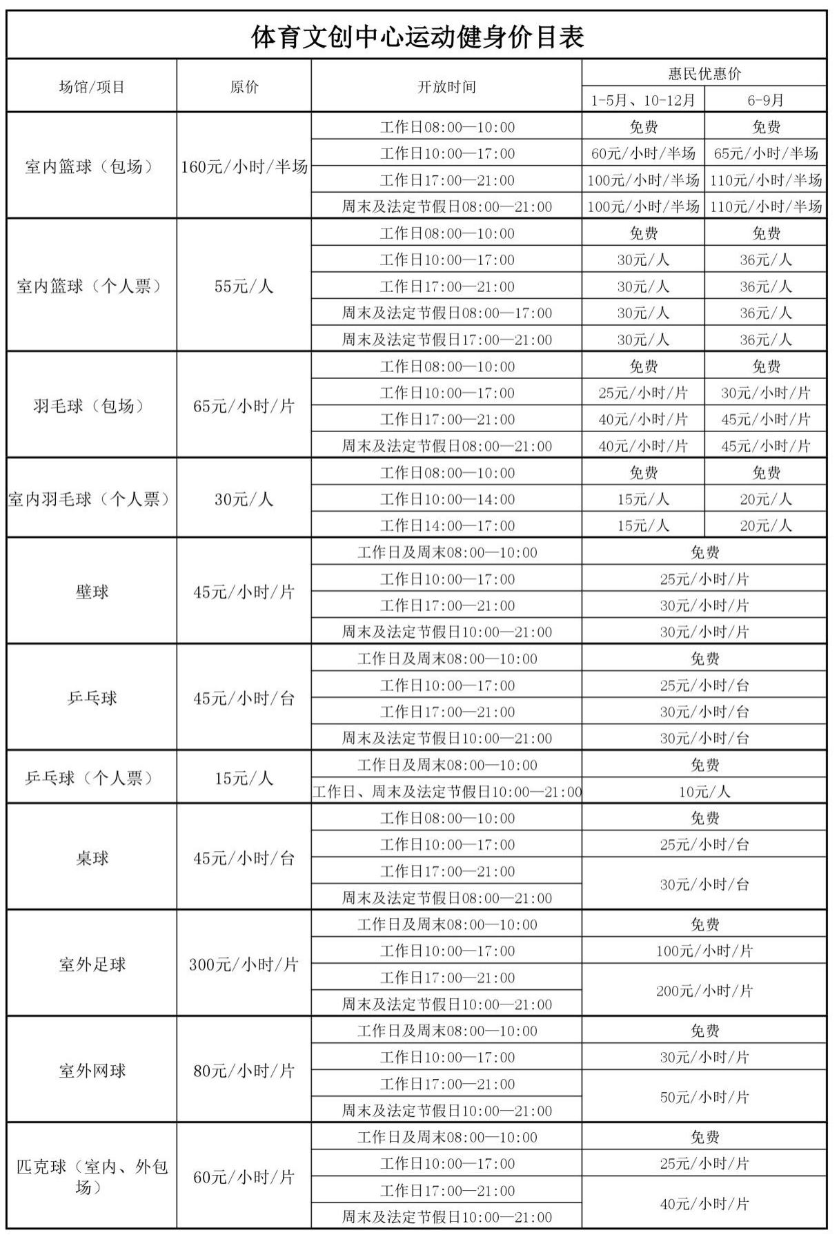 2.免费或低收费开放项目、开放时间及收费标准